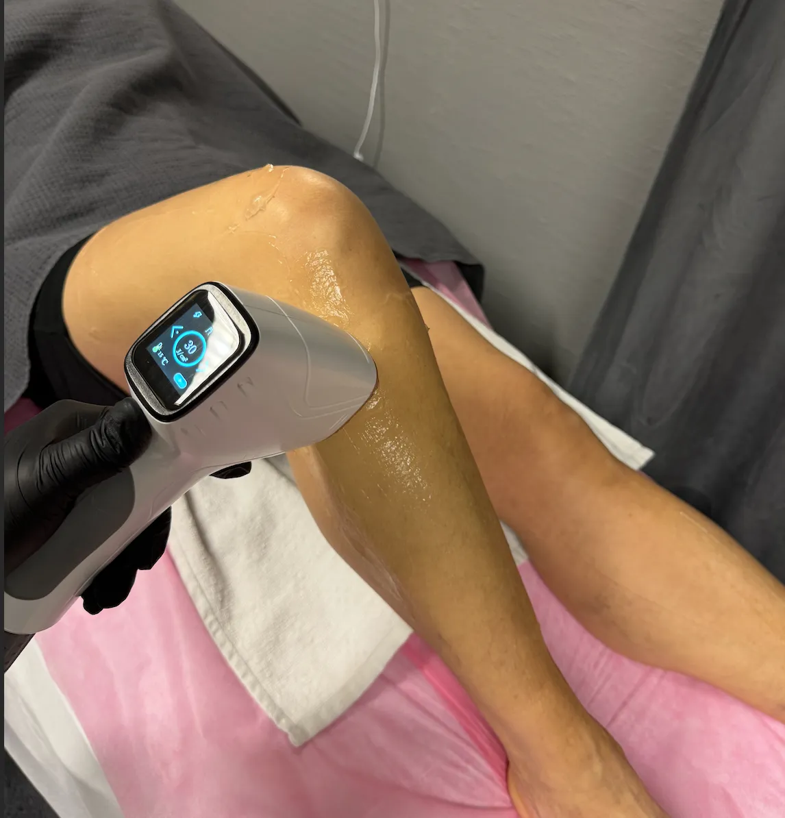 Ultraljudsgel appliceras, vilket medför optimal överföring från apparaten till det behandlade området. Därefter placeras apparaten på huden och dess styrka justeras utifrån hudtyp och område.